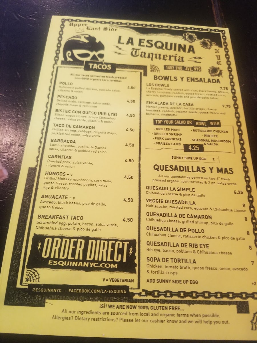 Welcome to La Esquina, a trendy Mexican oasis tucked away at 1402 2nd Ave in New York City. This vibrant eatery captures the essence of Mexican cuisine, offering a menu brimming with flavor and authenticity. Diners rave about the quesadilla de pollo, bursting with cheesy goodness and served with a delightful green sauce that brings just the right balance of zest.
